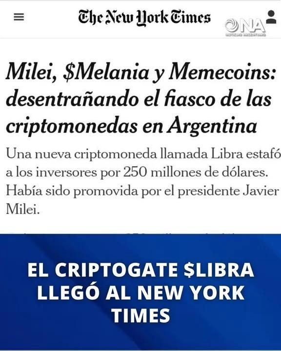 Además, la nota del New York Times menciona un audio de Hayden Davis, involucrado en el escándalo de Libra, en el que presuntamente se jacta de su influencia sobre Milei y su entorno. "Todo, desde los tuits de Milei hasta básicamente todas las cosas que se presentan de frente, tengo control sobre muchas de esas palancas. Pero tiene un costo", se escucha decir a Davis en un mensaje enviado a otro empresario.