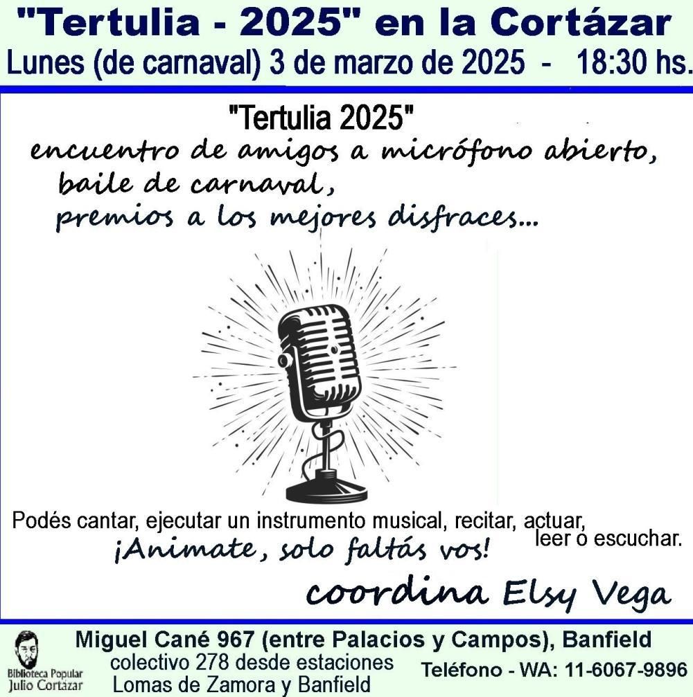 Con entrada libre y gratuita, la Biblioteca Popular Julio Cortázar abrirá este lunes sus puertas con el objetivo de festejar el Carnaval con un evento ligado a la expresión artística. Llega "Tertulia 2025", donde los vecinos podrán participar del micrófono abierto en Miguel Cané 967, Lomas.