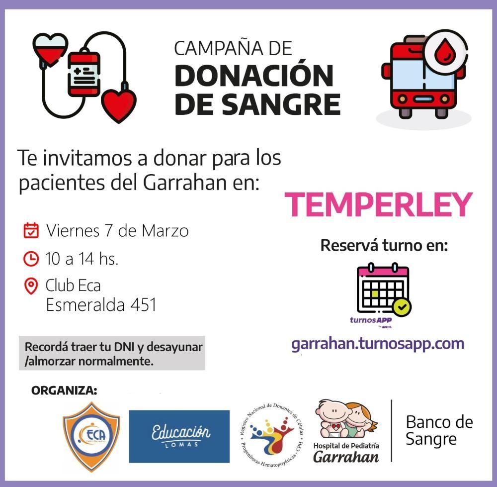 Una nueva campaña externa del Hospital Garrahan llega este viernes a Lomas con el objetivo de seguir concientizando sobre la importancia de donar sangre y además para que haya en la zona más donantes voluntarios y habituales. El Centro Recreativo ECA ubicado en Esmeralda 451, Temperley, será la sede donde los vecinos podrán acercarse para salvar vidas porque con una sola extracción se puede ayudar a más de tres personas.