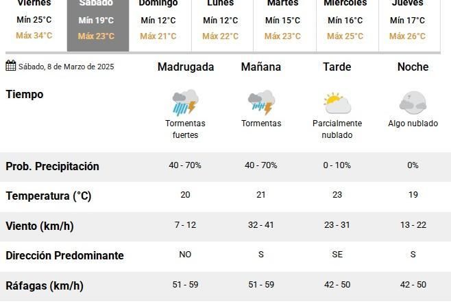 Hacia el sábado estará presente el descenso de temperatura, que rondará entre los 19° y los 23°, con una probabilidad de tormentas fuertes de entre el 40% y el 70% en la madrugada y la mañana. Por la tarde estará parcialmente nublado y ya sin lluvias.