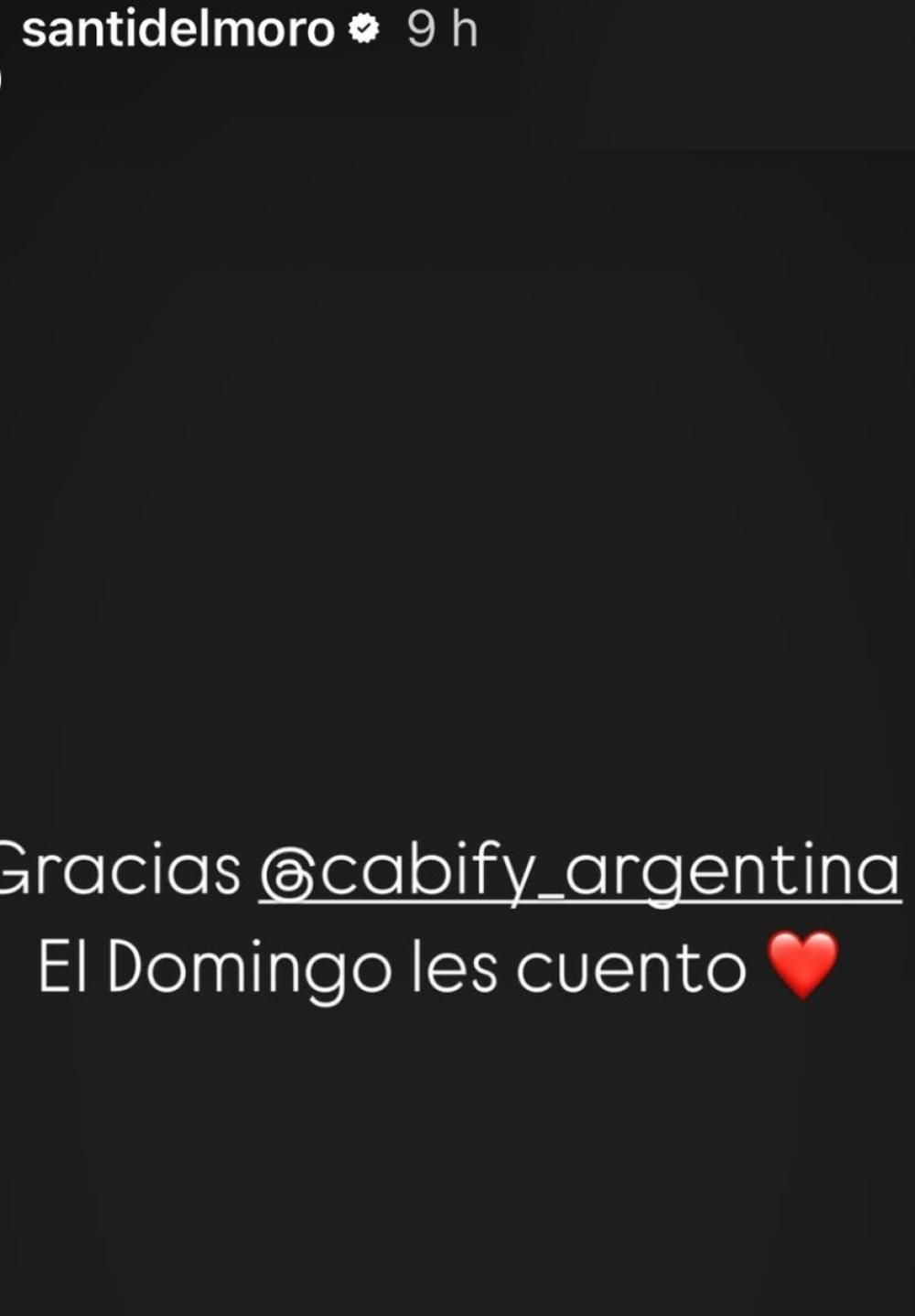 Sin embargo, las buenas noticias no parecen haber terminado allí, dado que este sábado Santiago del Moro publicó una historia de Instagram que generó mucho entusiasmo: arroba a la cuenta de Cabify, la empresa de viajes que traslada a los participantes que quedan eliminados.