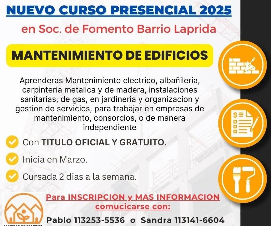 Un curso muy completo brindará la Sociedad de Fomento Barrio Laprida totalmente gratuito y con título oficial para quienes quieran obtener una rápida salida laboral. Mantenimiento de edificios será la próxima alternativa que se suma a las tres que este año ha incorporado el espacio. Los interesados ya se pueden anotar porque hay sólo 20 cupos disponibles y quedan los últimos lugares.