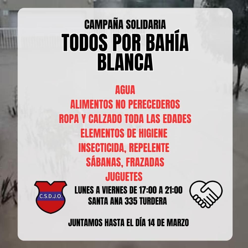 El Club Social y Deportivo Juventud Obrera de Turdera lanzó una campaña solidaria a beneficio de los vecinos de Bahía Blanca, que el pasado viernes sufrió un temporal que ya dejó más de una decena de fallecidos. La institución local busca apelar a la solidaridad de los lomenses para poder colaborar con la ciudad que quedó bajo el agua.