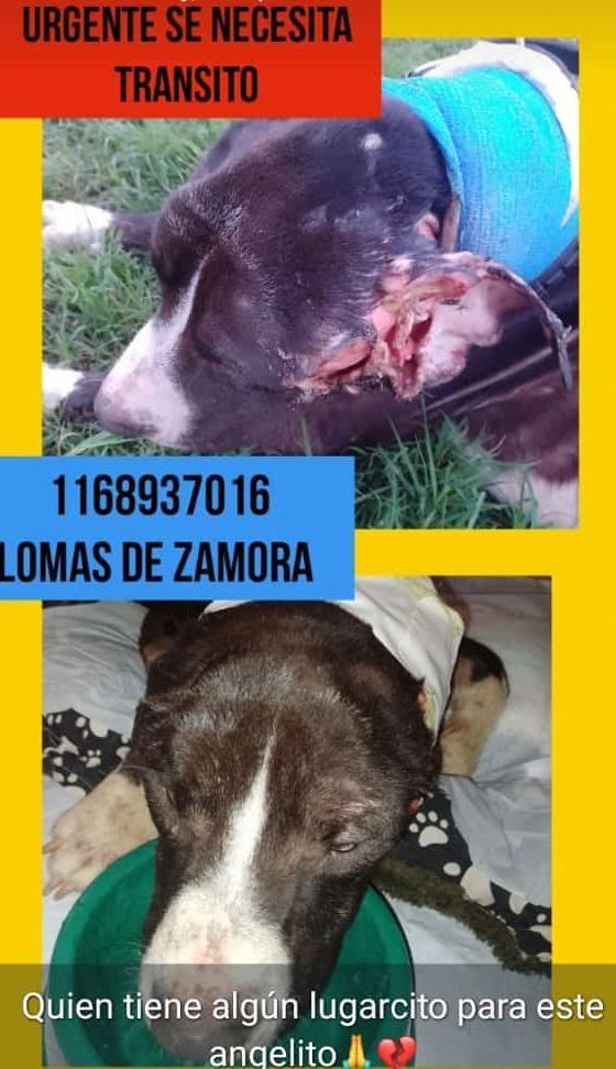 Es un perro que tiene una herida muy grande y requiere de curaciones permanentes. La rescatista que lo salvó requiere tránsito y colaboración económica.