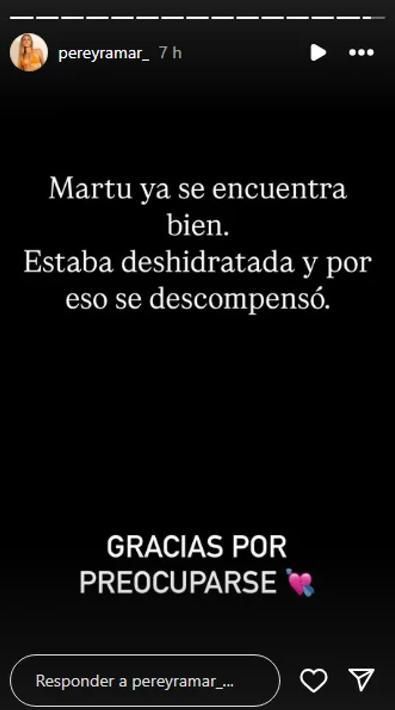 "Martu ya se encuentra bien. Estaba deshidratada y por eso se descompensó", aclararon sobre la razón de su desmayo.