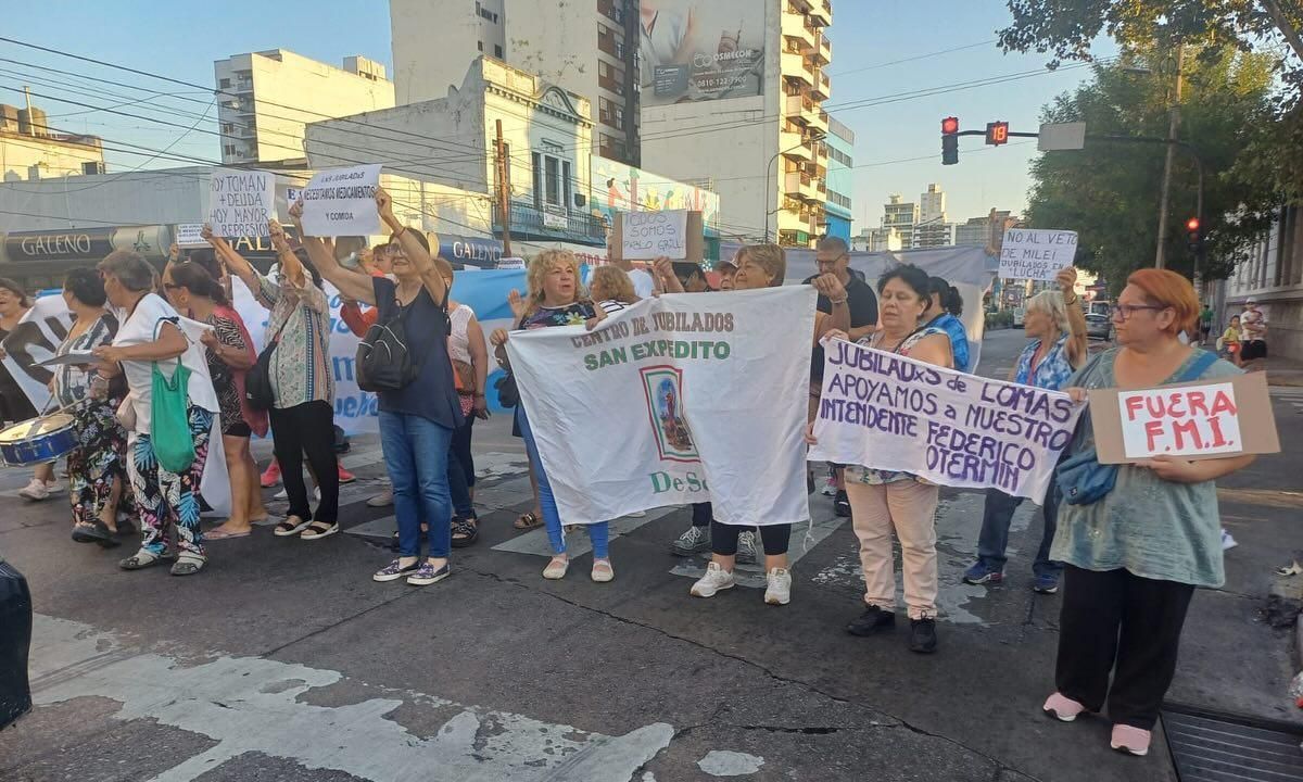 Cada vez que el semáforo se pone en rojo, los adultos mayores de distintos centros de jubilados del distrito descienden desde la Plaza Grigera hacia la avenida Hipólito Yrigoyen para expresar su bronca y reclamo ante el Gobierno nacional por los magros haberes que perciben.