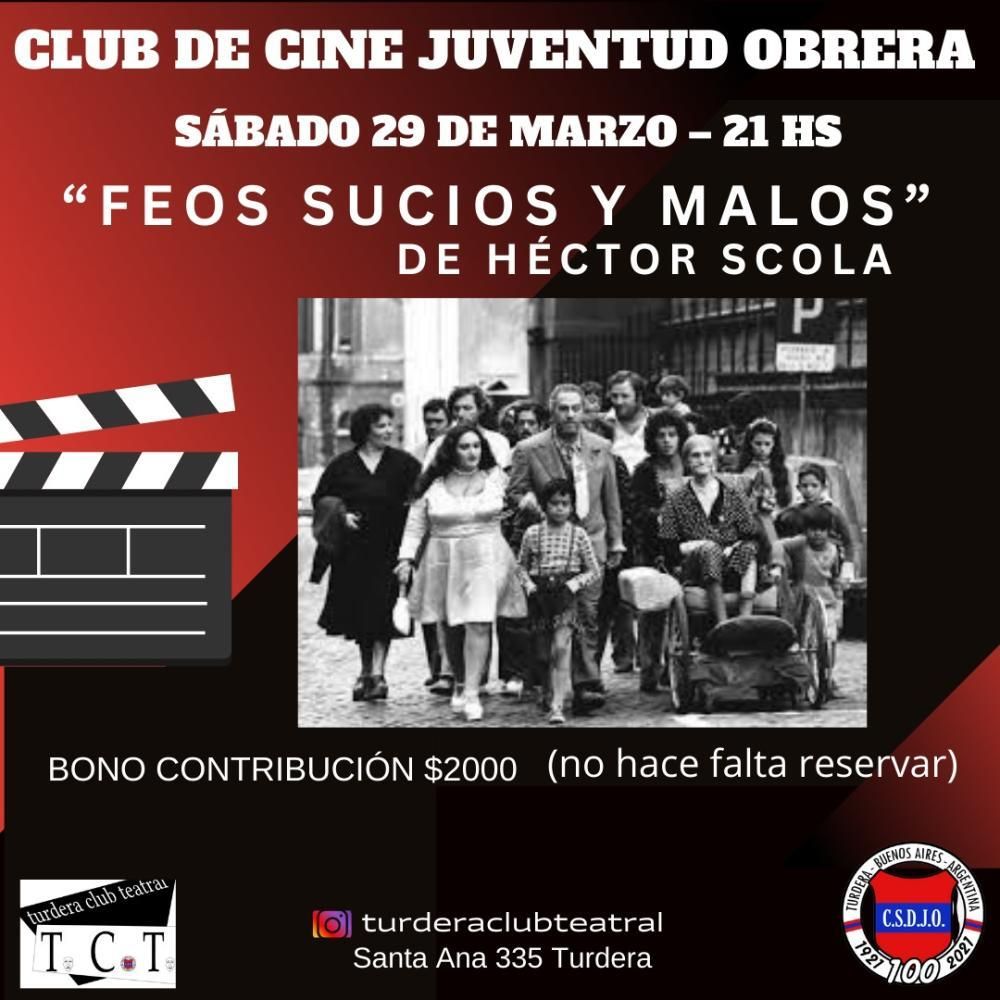 El Club Social y Deportivo Juventud Obrera de Turdera, a través del espacio Turdera Club Teatral, inaugurará su temporada de cine este sábado, cuando se proyecte la película "Feos, sucios y malos". Las entradas ya se encuentran a la venta y estarán a disposición hasta el mismo día del evento.