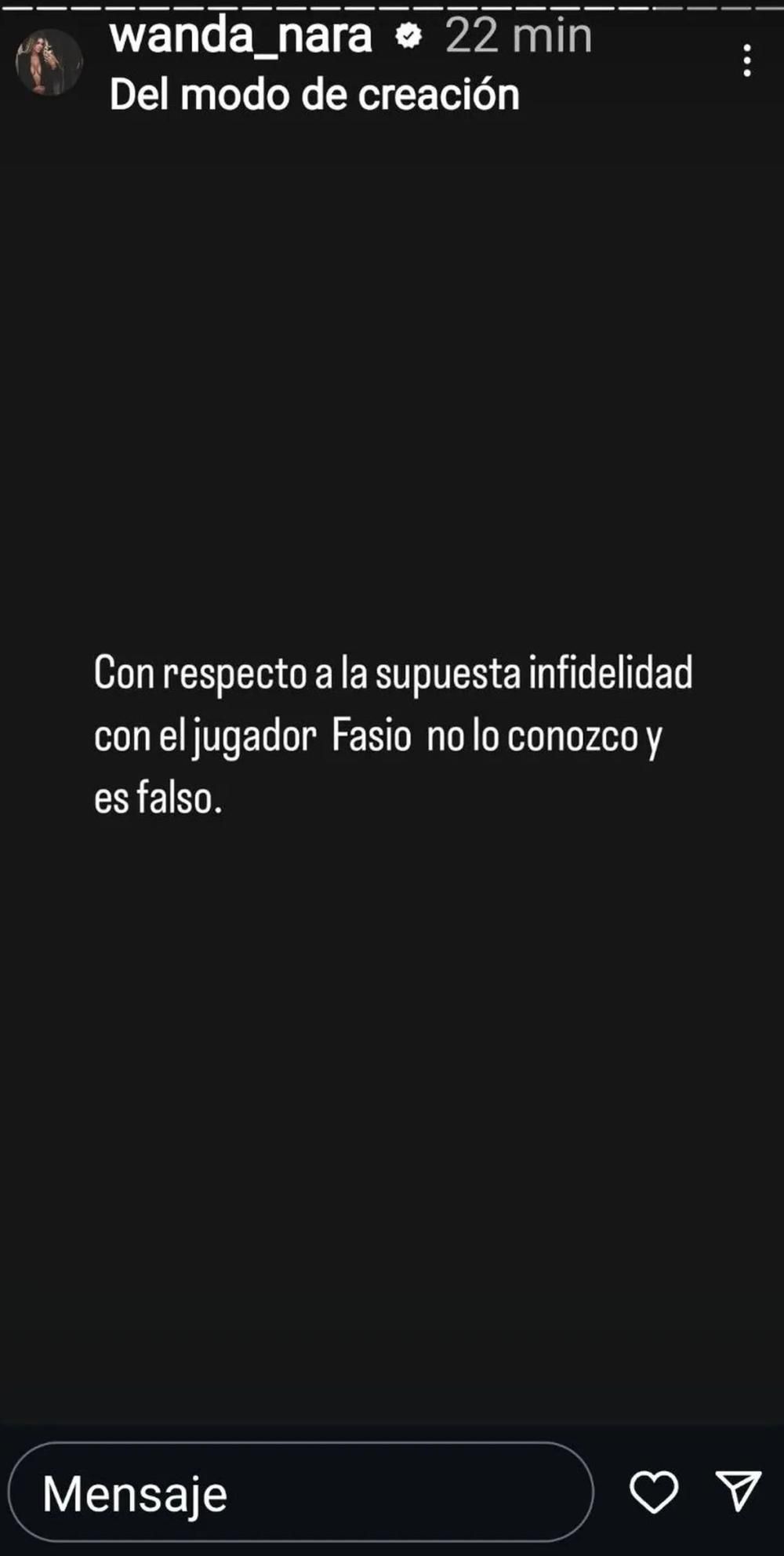"Con respecto a la supuesta infidelidad con el jugador Fasio, no lo conozco y es falso", escribió Wanda en su post de Instagram, con un leve error en el apellido del futbolista que se escribe con "Z" y no con "S" como lo expresó.