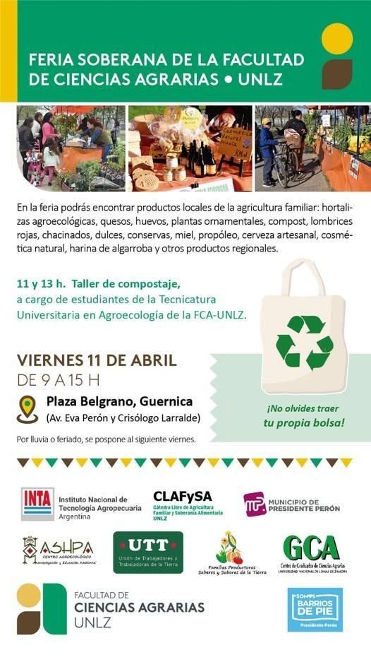 Una Feria Soberana se hará el próximo viernes 11 de abril de 9 a 15, de la mano de la Universidad de Lomas y del Instituto Nacional de Tecnología Agropecuaria, con el objetivo de vincular en forma directa a productores de la agricultura familiar y consumidores de la zona.