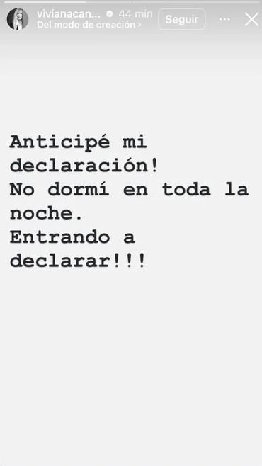 Con una historia en su cuenta de Instagram, la periodista reveló que se apersonó ante la Justicia, algo que iba a realizar este miércoles, según anticipó en su editorial: "Anticipé mi declaración! No dormí en toda la noche. Entrando a declarar".