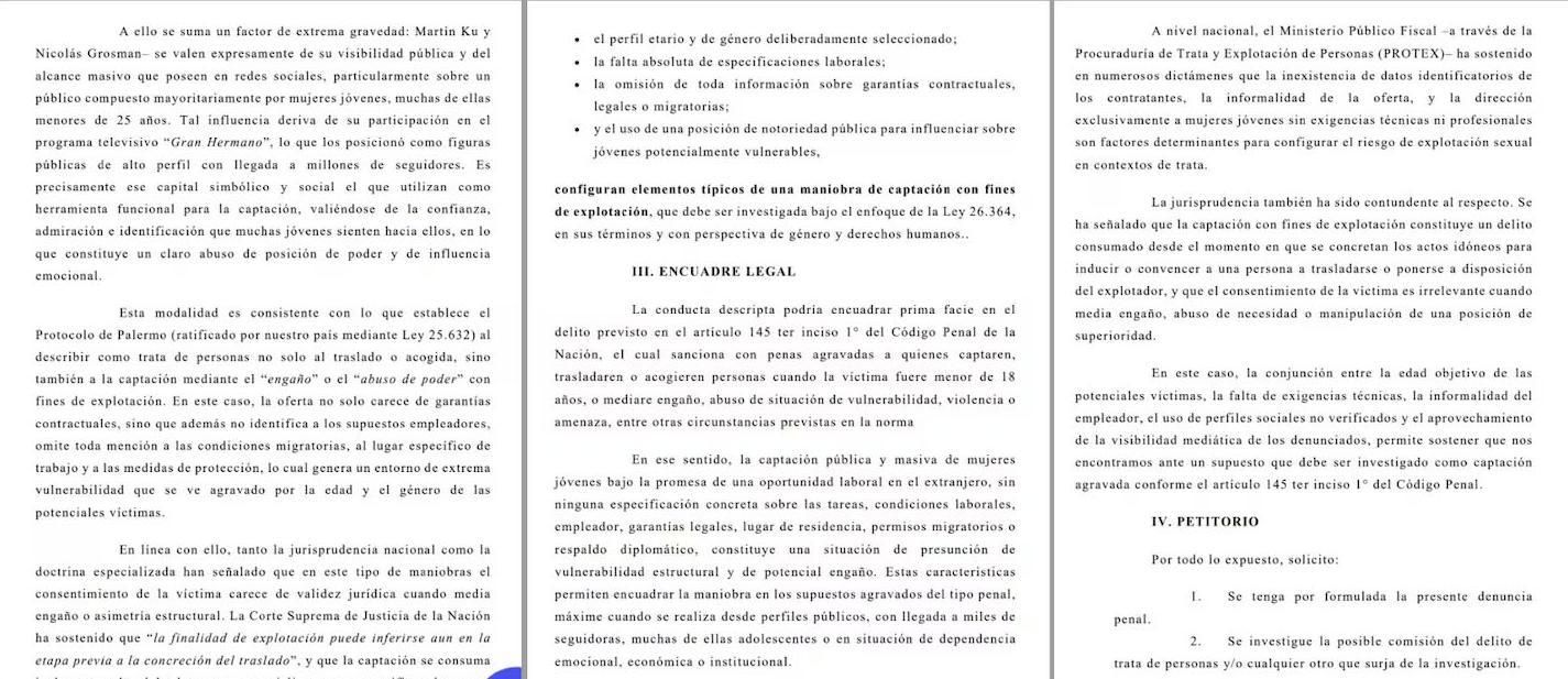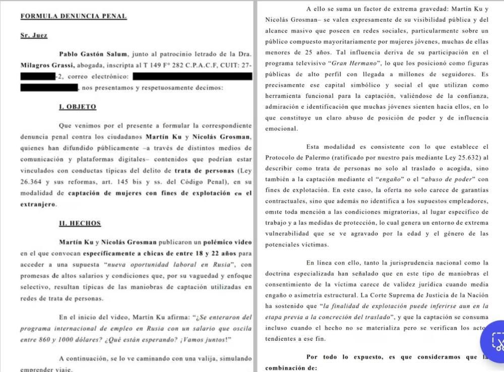 A través de su cuenta en X, Salum informó los detalles de la denuncia que presentó contra los jóvenes por la sospechosa campaña publicitaria. "Radicamos una denuncia formal para que se investigue si detrás del ofrecimiento laboral participantes de Gran Hermano, Martín Ku y Nicolás Grosman, podría estar operando una organización coercitiva, posiblemente con vínculos entre Argentina y Rusia", explicó.