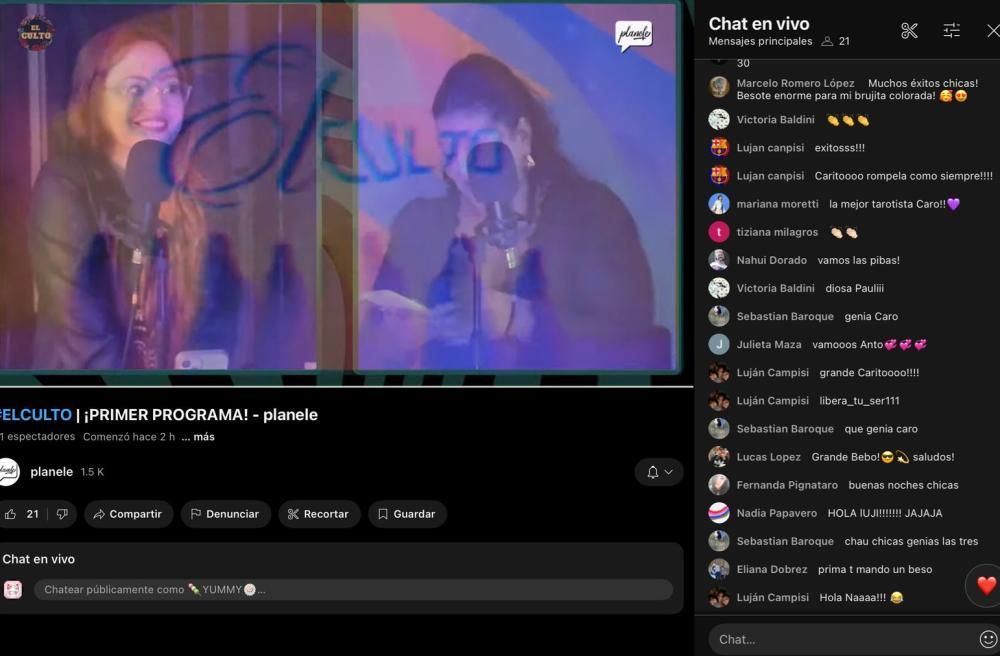 "El Culto" es el nombre del programa de streaming que sale todos los viernes de 21 a 23 por el canal lomense Planele y que tiene como conductoras a las amigas que contaron que desde muy chicas les apasiona el mundo paranormal por historias personales que vivieron y por todo lo que han consumido en diferentes medios de comunicación.
