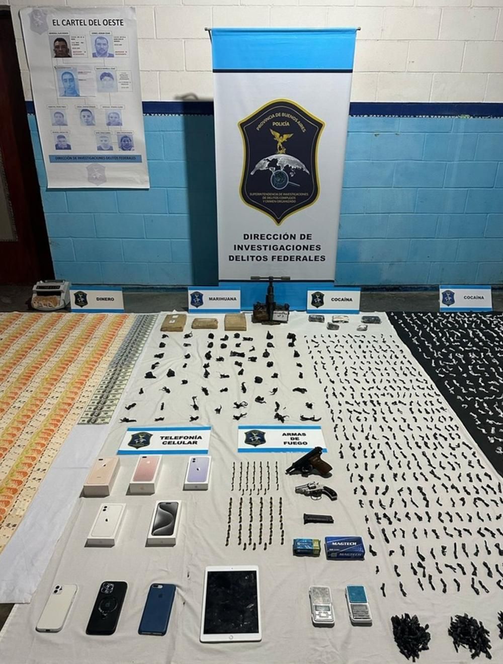 Además, incautaron 3.800 dólares, 15.550.000 pesos, un revólver calibre 32, una pistola calibre 22, 16 teléfonos celulares, cerca de 90 municiones, 400 gramos de cocaína, casi tres kilos de marihuana, una camioneta Volkswagen Amarok y un auto Peugeot 308.