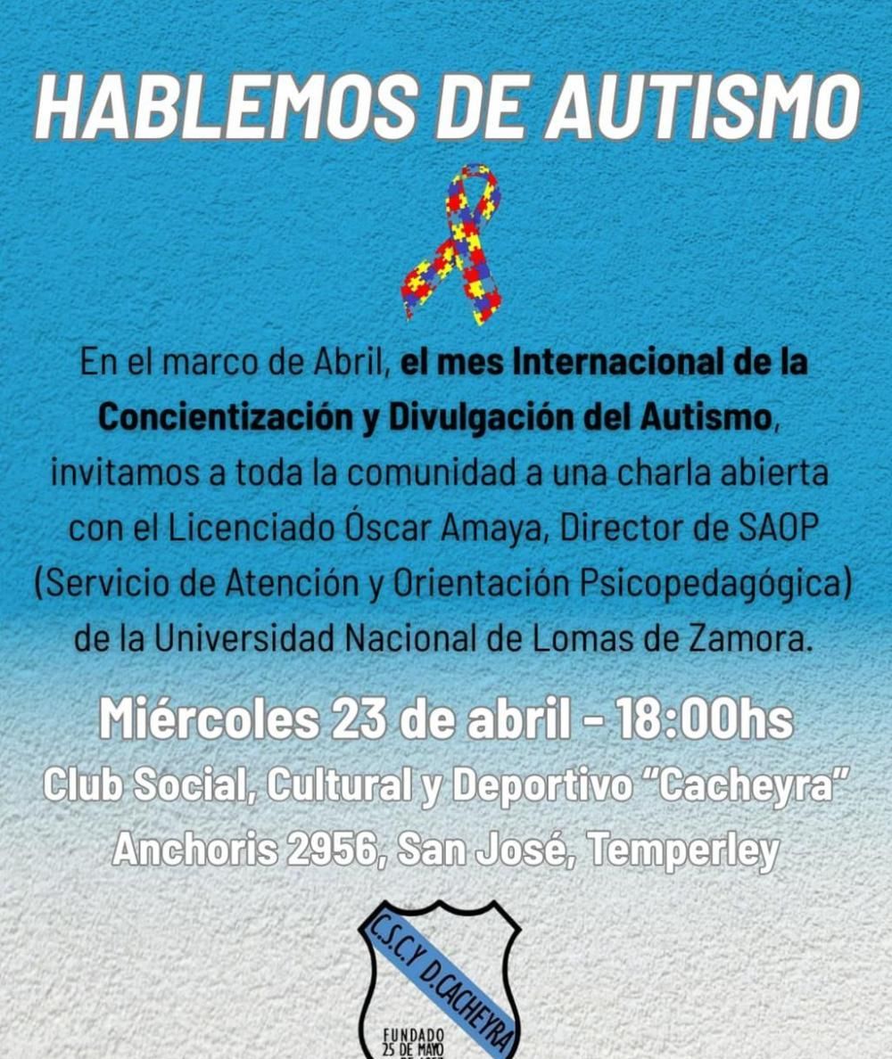 El Club Social, Cultural y Deportivo Cacheyra de San José logró reabrir sus puertas en marzo y ya programó lo que será una de sus primeras actividades desde su vuelta: este miércoles 23 de abril realizará una charla abierta sobre autismo, la cual contará con la presencia de Oscar Amaya, director del Servicio de Atención y Orientación Psicopedagógica (SAOP) de la Universidad Nacional de Lomas.
