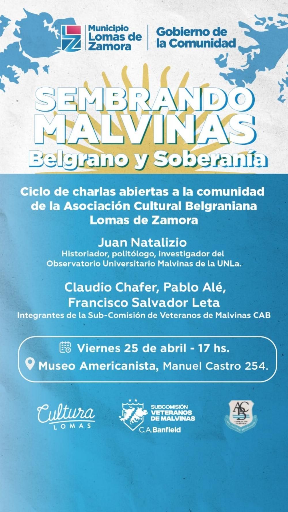 La Asociación Cultural Belgraniana de Lomas llevará a cabo un ciclo de charlas abiertas a la comunidad llamadas "Sembrando Malvinas: Belgrano y soberanía". La actividad se realizará este viernes en el Museo Americanista de Lomas.