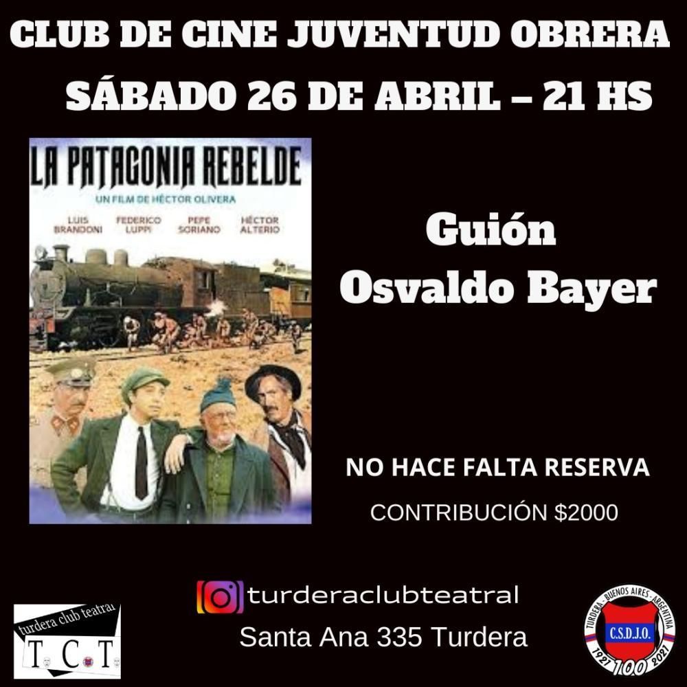 El Club Juventud Obrera de Turdera, con la organización de Turdera Club Teatral, continúa con su ciclo mensual de cine. En esta oportunidad, proyectan "La Patagonia rebelde", un exitoso film protagonizado por un elenco de gran nivel nacional. Es este sábado a las 21 y no se necesita reserva previa para asistir al encuentro.