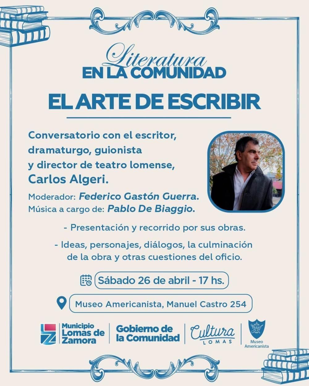 El ciclo Literatura en la Comunidad no detiene su marcha y continúa ocupando su agenda con actividades gratuitas pensadas para los lomenses. En esta ocasión, este sábado preparan un conversatorio llamado "El arte de escribir", donde el escritor, dramaturgo, guionista y director lomense Carlos Algeri se presentará para hablar de sus obras, además de enseñar secretos del oficio.