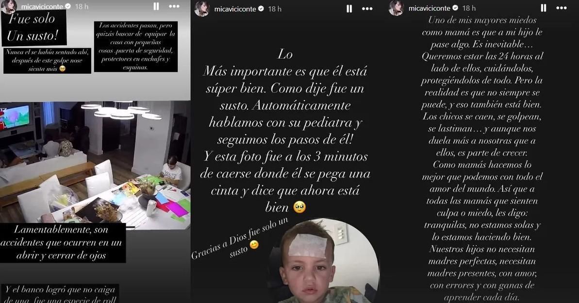 "¡Fue solo un susto! Nunca él se había sentado así, después de ese golpe no se sienta más. Los accidentes pasan, pero quizás buscar de equipar la casa con pequeñas cosas. Lamentablemente son accidentes que ocurren en un abrir y cerrar de ojos. Y el banco que no caiga de una, fue una especie de roll", explicó Mica Viciconte en sus historias de Instagram.