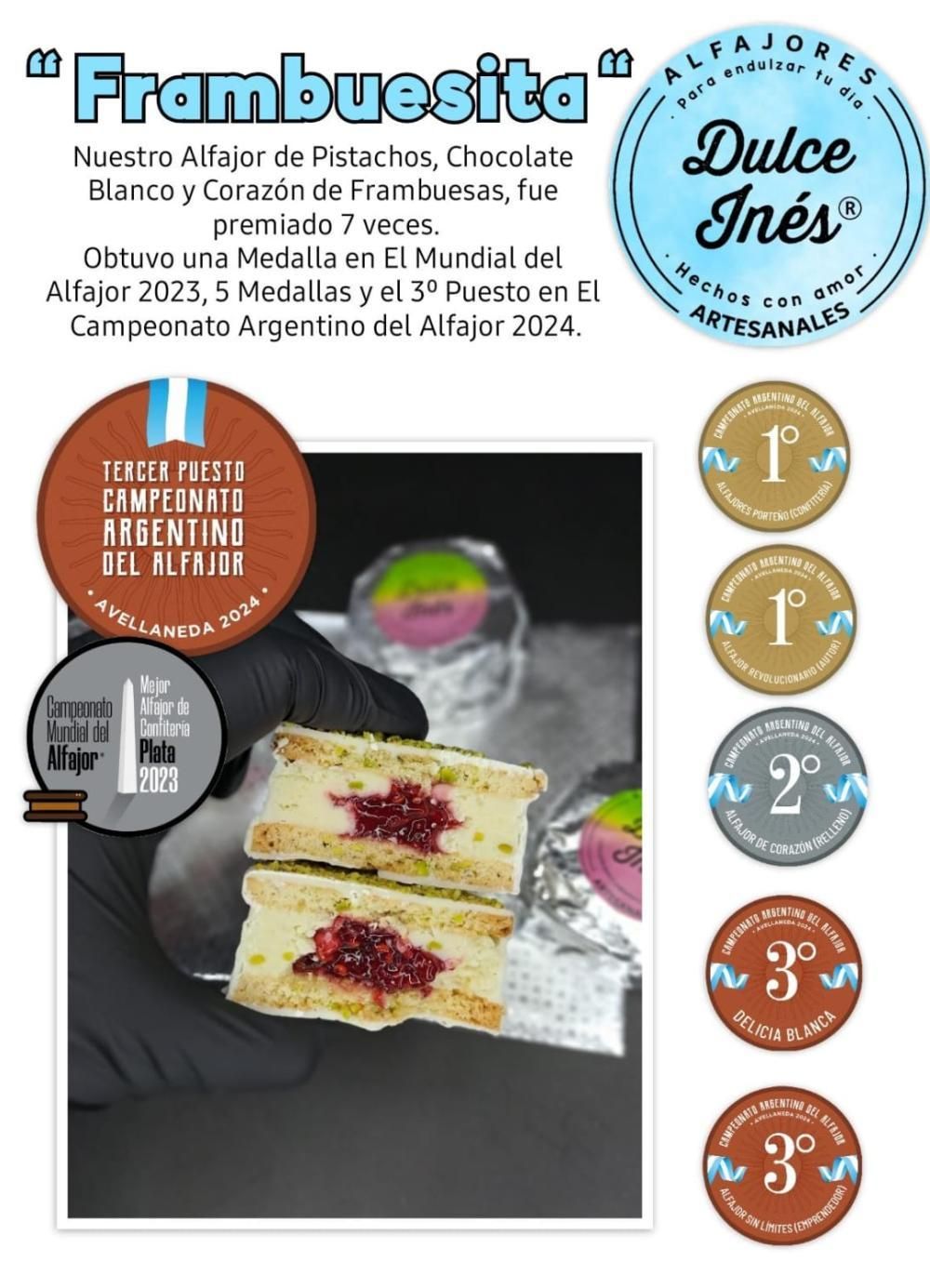 Los vecinos van a poder degustar y comprar el alfajor ganador que es el de pistachos, chocolate blanco y corazón de frambuesa que obtuvo varios reconocimientos: una medalla en el Mundial del Alfajor 2023, 5 medallas y el tercer puesto en el Campeonato Argentino 2024.
