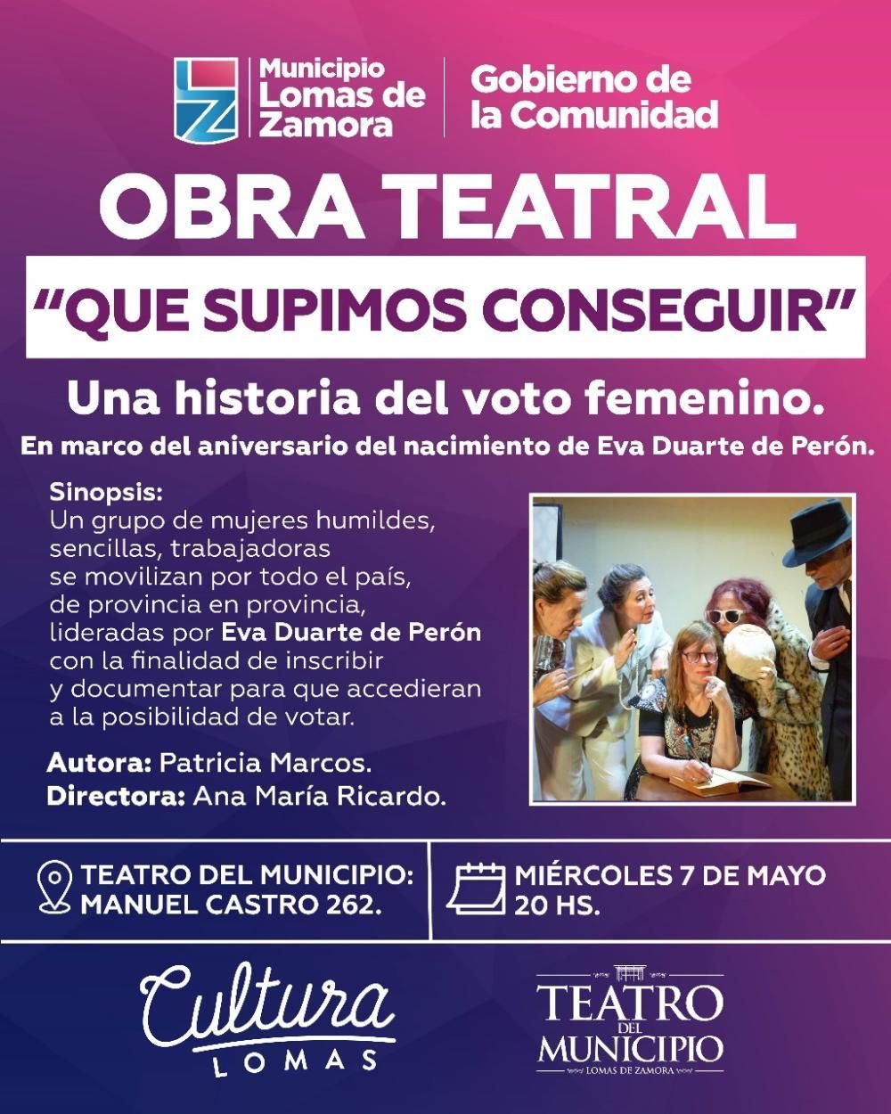 En el marco del 106º aniversario del nacimiento de Eva Duarte de Perón, el Municipio de Lomas pondrá a disposición una obra teatral llamada "Que supimos conseguir: una historia del voto femenino". La función se llevará a cabo el próximo miércoles 7 de mayo y ya se pueden reservar las entradas.