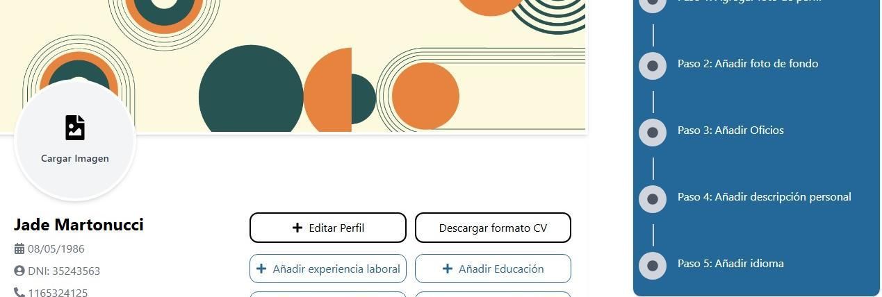 Por ejemplo, en el caso de que seas un postulante: primero, tu foto de perfil; foto de fondo; los oficios que sabés; una descripción personal y finalmente el idioma. También podrás cargar tu formación y estudios, experiencias laborales, habilidades e inclusive, podés descargar tu perfil en formato de CV (currículum). Siempre que lo requieras podrás editar tu perfil para modificarlo.