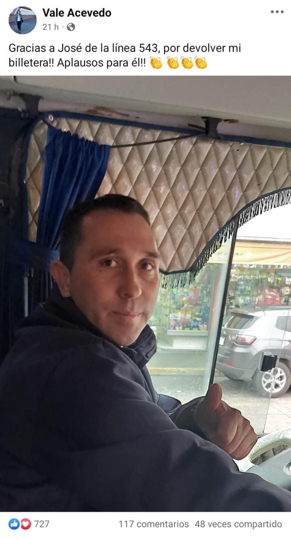 La usuaria Vale Acevedo, dueña de la billetera, eligió Facebook para publicar la foto que le sacó a Verón y escribió: "Gracias a José de la línea 543 por devolver mi billetera. Aplausos para él". La publicación sumó más de 700 "Me Gusta" y un centenar de comentarios positivos para el colectivero. Un gesto que vale la pena dar a conocer.