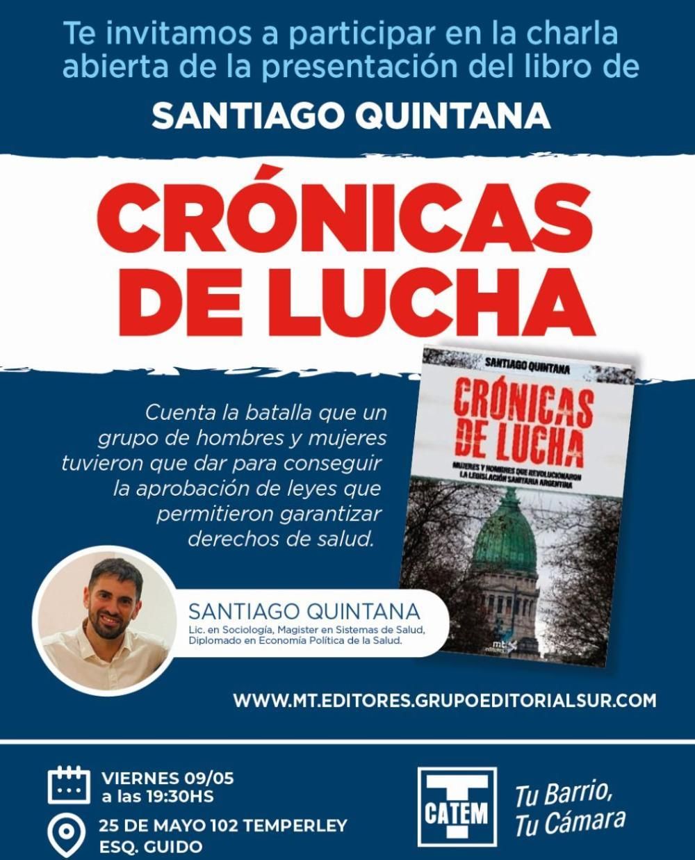 La primera obra literaria del sociólogo especialista en Salud Santiago Quintana se presentará este viernes a las 19.30 en la Cámara de Comercio de Temperley, ubicada en 25 de Mayo 102. Se trata del libro "Crónicas de Lucha", el cual narra la historia de aquellos referentes que lucharon para impulsar distintas leyes con el objetivo de mejorar la salud.
