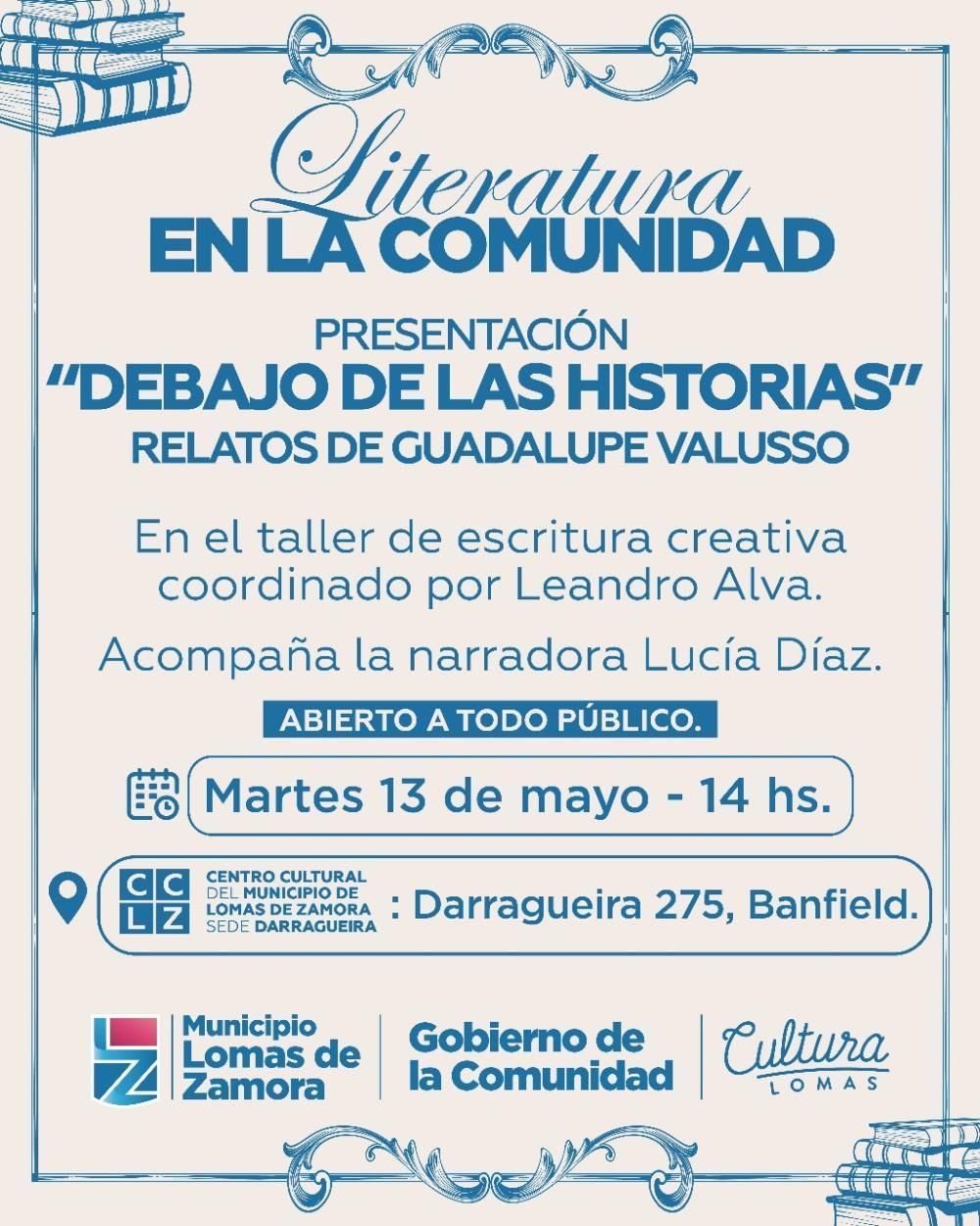 En el marco del ciclo Literatura en la Comunidad, la escritora lomense Guadalupe Valusso presentará su libro "Debajo de las historias" en el Centro Cultural Darragueira. La jornada se hará el próximo martes 13 de mayo, con entrada libre y gratuita para todos los vecinos de Lomas.