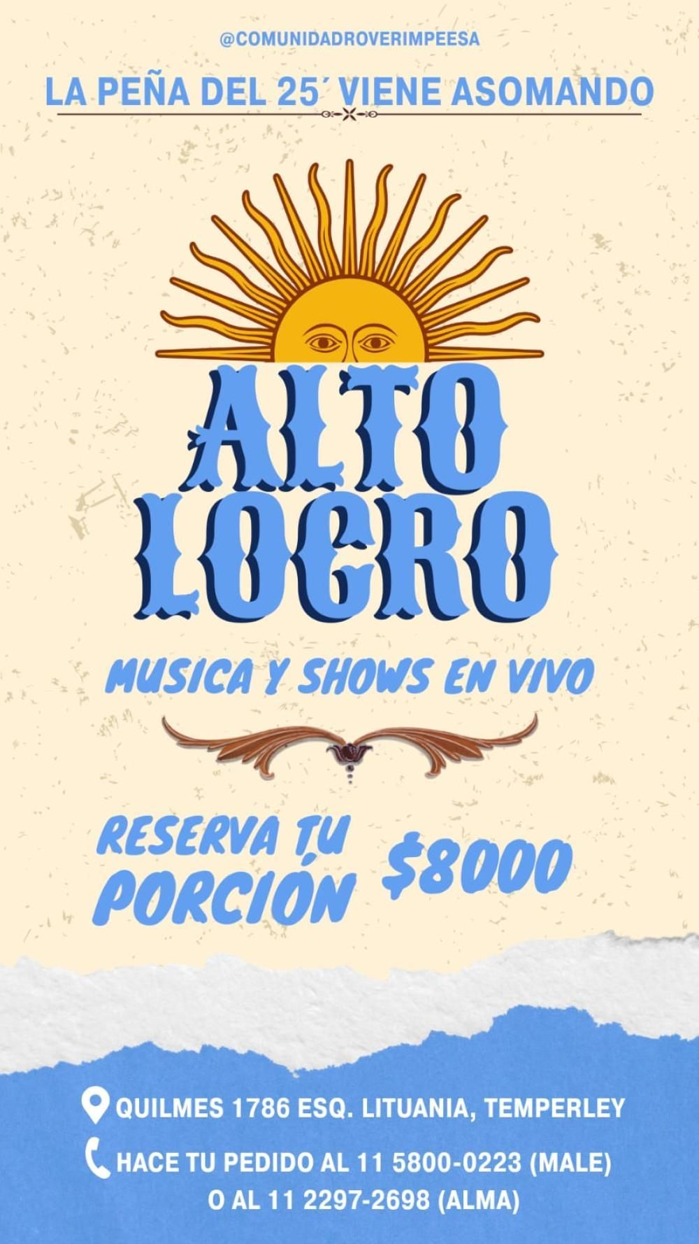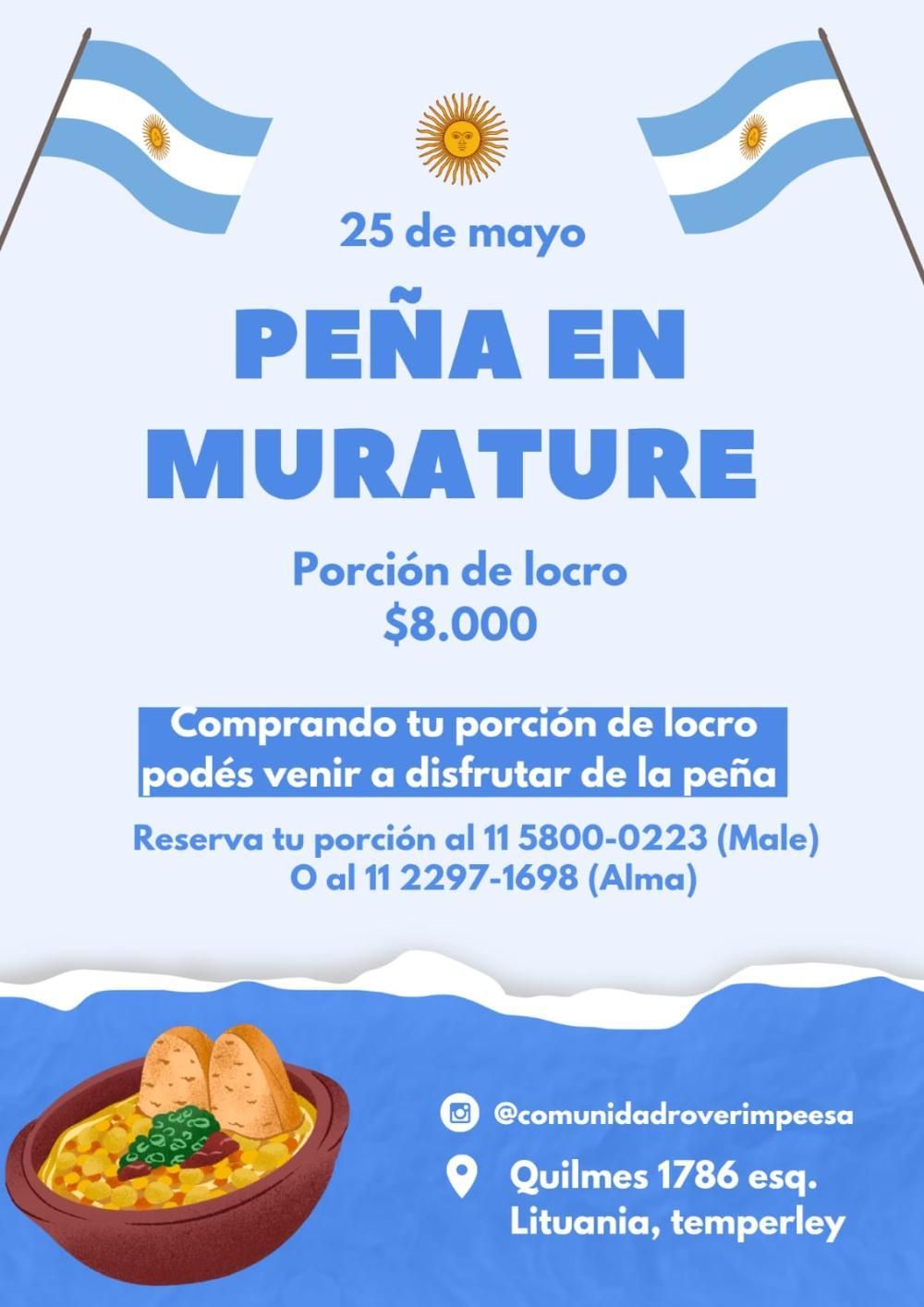 En el marco del Día de la Revolución, la comunidad Rover Impeesa del Grupo Scout José Murature venderá porciones de locro a $8.000, las cuales ya pueden ser reservadas (a Malena al 1158000223 o a Alma al 1122971698) para ser retiradas el mismo domingo 25 de mayo por la sede ubicada en Quilmes 1786, esquina Lituania. Para la reserva, que se hará a partir de las 11, es necesario abonar el 50% del valor de la porción, mientras que al momento de ir buscar la porción se solicita asistir con un recipiente plástico.