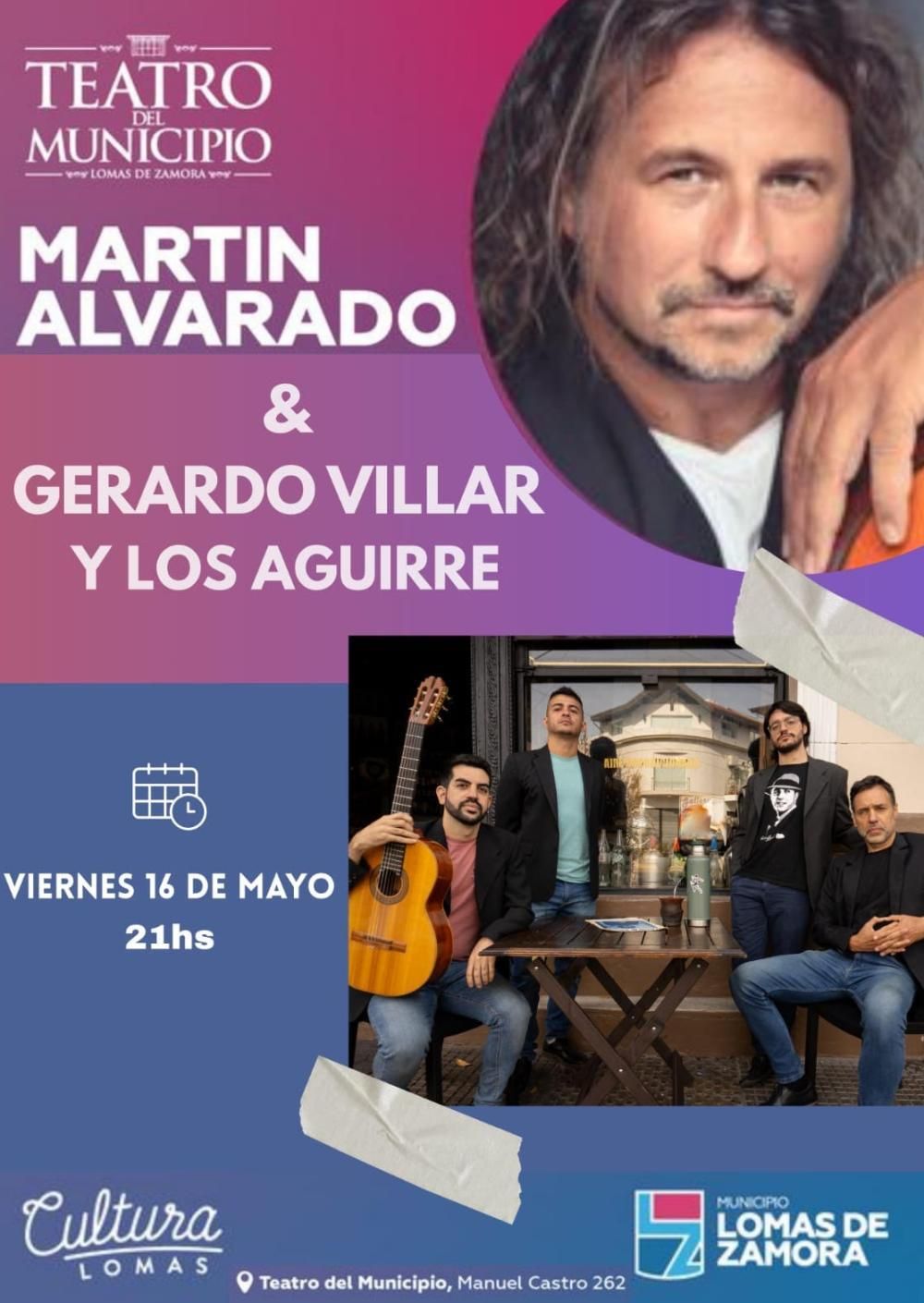 En Manuel Castro 262, Lomas, va a estar acompañado por Gerardo Villar y Los Aguirre: un grupo conformado en 2017 por jóvenes y talentosos músicos egresados de los Conservatorios Julián Aguirre de Banfield, Manuel de Falla y la Escuela de Música Popular de Avellaneda.