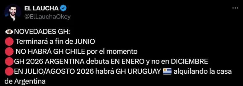 Pero lo más importante llegó después, ya que reveló: "GH 2026 Argentina debuta en enero y no en diciembre. En julio/agosto 2026 habrá GH Uruguay alquilando la casa de Argentina".