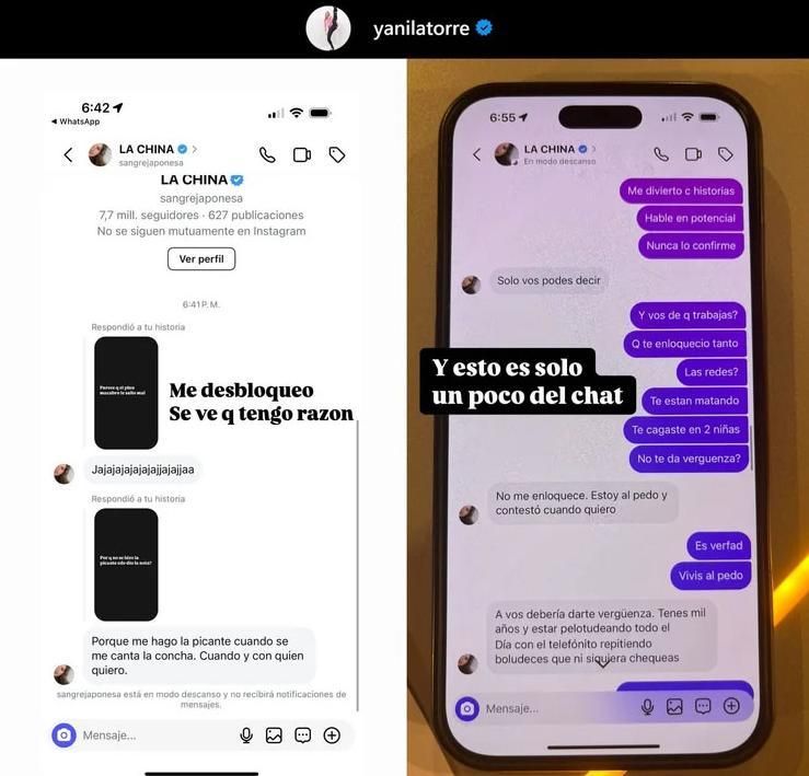 Mientras la conductora de Sálvese Quien Pueda se encontraba en vivo, la actriz la desbloqueó de Instagram y respondió a sus historias con mensajes amenazadores: "Porque me hago la picante cuando se me canta la concha. Cuando y con quien quiero", escribió la China.