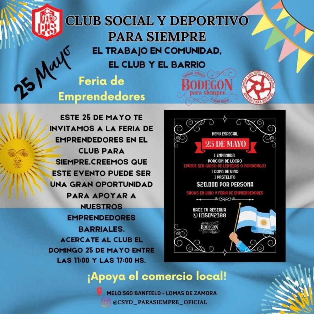 El Club Social y Deportivo Para Siempre de Banfield se prepara para un fin de semana a pura actividad. Este domingo 25 de mayo realizarán, en simultáneo, una venta de un menú tradicionalista con motivo del Día de la Revolución y una feria de emprendedores: parte de lo recaudado será para mejorar las instalaciones de la institución.