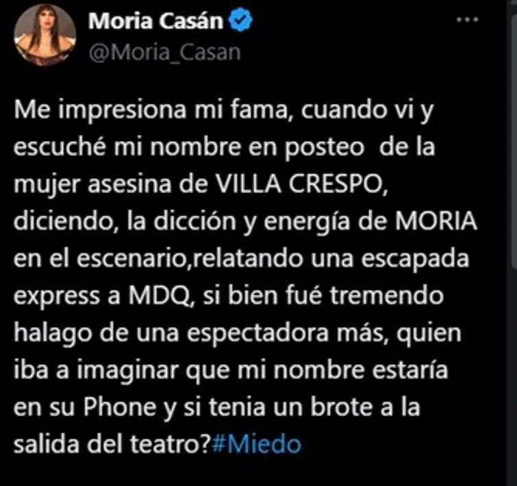"Me impresiona mi fama, cuando vi y escuché mi nombre en posteo de la mujer asesina de Villa Crespo, diciendo, la dicción y energía de Moria en el escenario, relatando una escapada express a MDQ, si bien fue tremendo halago de una espectadora más, quien iba a imaginar que mi nombre estaría en su Phone y si tenía un brote a la salida del teatro? #Miedo".