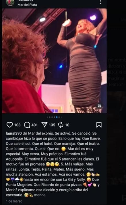 "Un Mardel (Mar del Plata) exprés: se activó, se canceló y se cambió. Se hizo lo que se pudo y es lo que hay: que llueve, que sale el sol, que el hotel, que manejar, que el teatro, que la tormenta, que sí y que no. Mardel es muy especial, muy cerca y muy práctico. Los motivos fueron Aquopolis y que que el 5 arrancan las clases", había escrito la mujer en sus redes, donde también elogió a Moria Casán, a quien fueron a ver en su espectáculo.