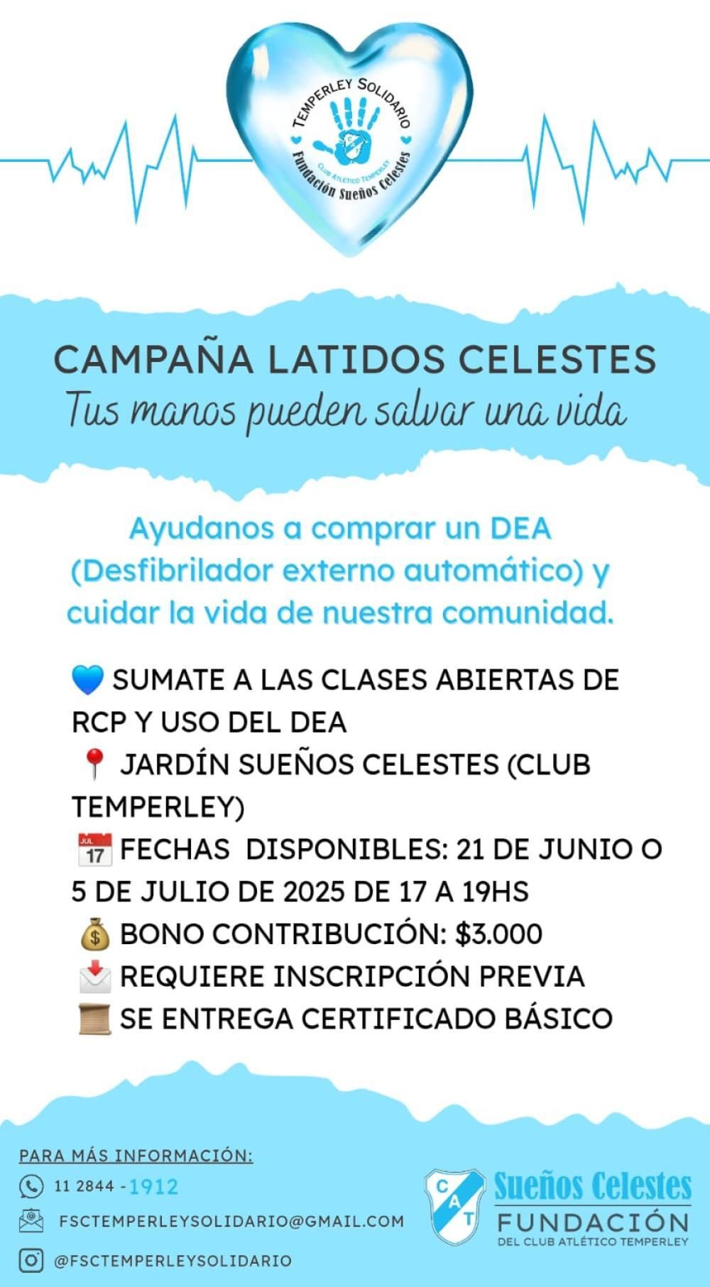 La campaña "Latidos Celestes" que acaba de lanzar el Club Atlético Temperley a través de su Fundación es sumamente importante porque apunta a concientizar sobre la importancia de aprender las técnicas de RCP que salvan vidas y porque con lo recaudado van a adquirir un DEA (Desfibrilador Externo Automático) para "cuidar a la comunidad".