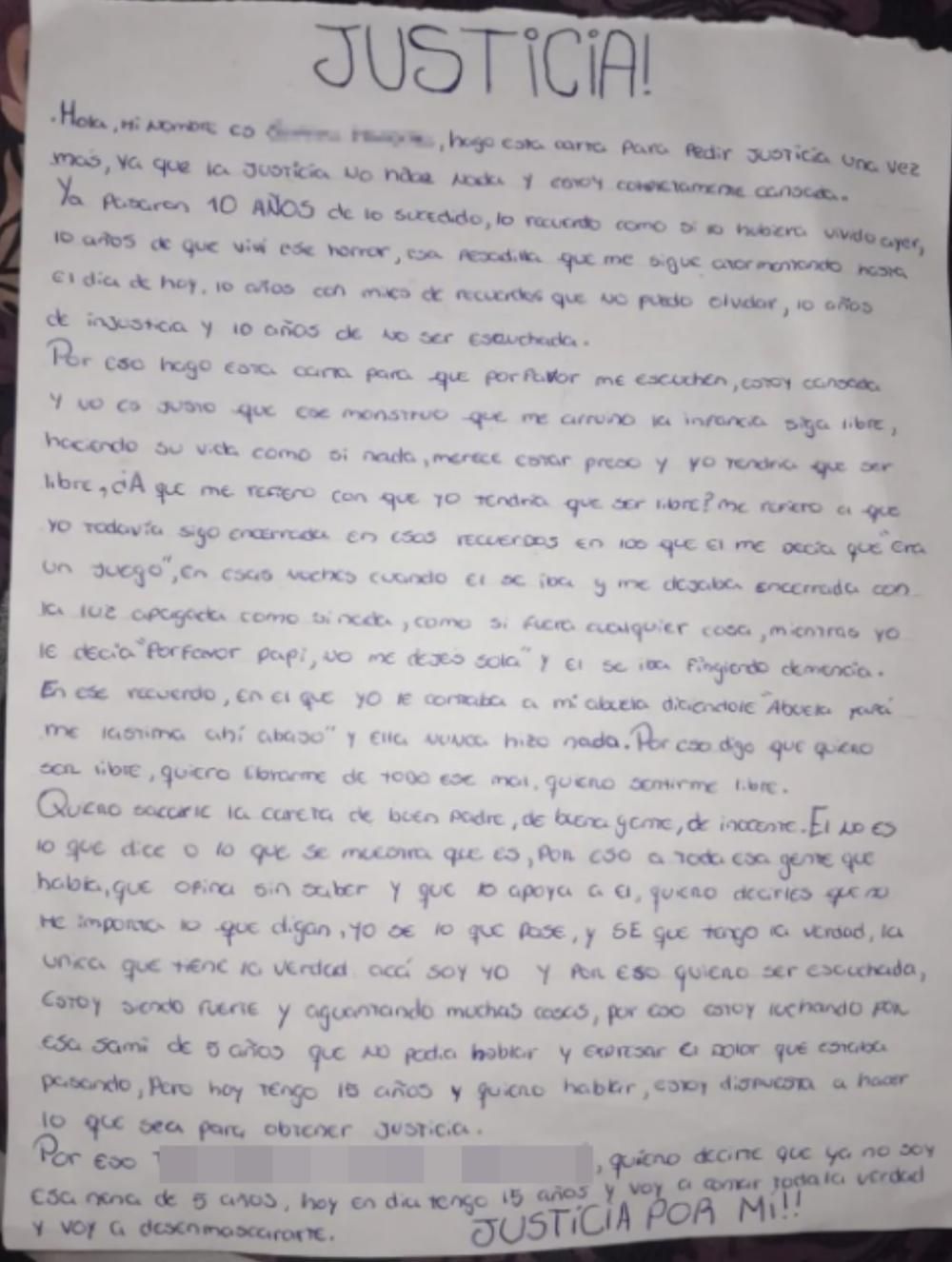 Por su parte, la víctima escribió una carta de puño y letra para pedir justicia. La adolescente, que ahora tiene más de 15 años, pidió declarar nuevamente para "desenmascarar" al acusado.