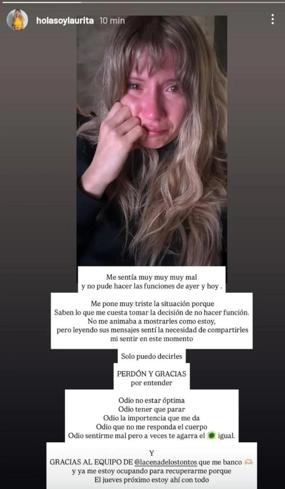 "Me pone muy triste la situación, porque saben lo que me cuesta tomar la decisión de no poder hacer función. No me animaba a mostrarles cómo estoy, pero leyendo sus mensajes sentí la necesidad de compartirles mi sentir en este momento", siguió explicando.