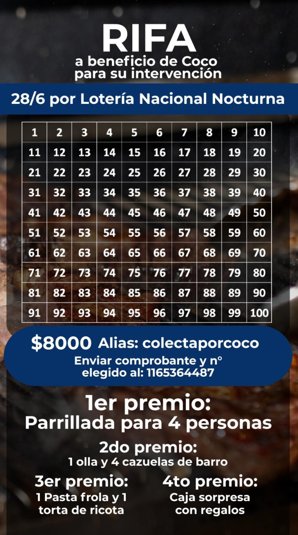 El valor del número es de $8.000 y hay que transferir al alias: colectaporcoco y luego enviar el comprobante y número elegido al 1165364487