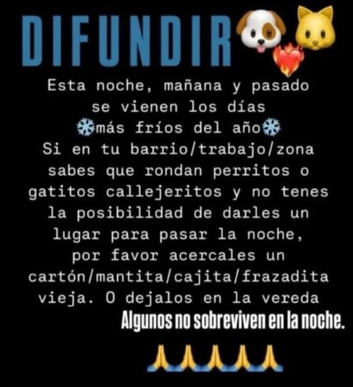 Se vienen los días más fríos del año. Si en tu barrio o cerca de tu trabajo rondan perros o gatos callejeros y no tenés la posibilidad de darles un lugar, por favor acercales un cartón, manta, caja o frazada. Algunos no sobreviven a la noche