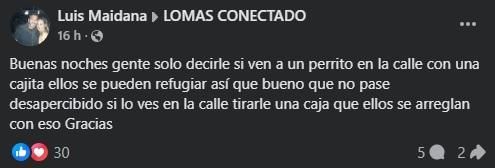 A través de distintos grupos de Facebook que están integrados por los propios lomenses, varios usuarios aprovecharon el alcance que tienen las redes sociales para dejar un mensaje de concientización: cuidar a los animales de la ola polar.