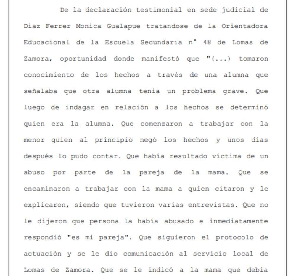 El caso fue descubierto por una docente de la Escuela Secundaria 48 de Lomas, que había sido advertida por una alumna. En su declaración, la maestra contó que tomaron conocimiento de los hechos a través de una compañera de la víctima, quien le manifestó otra alumna tenía "un problema grave".