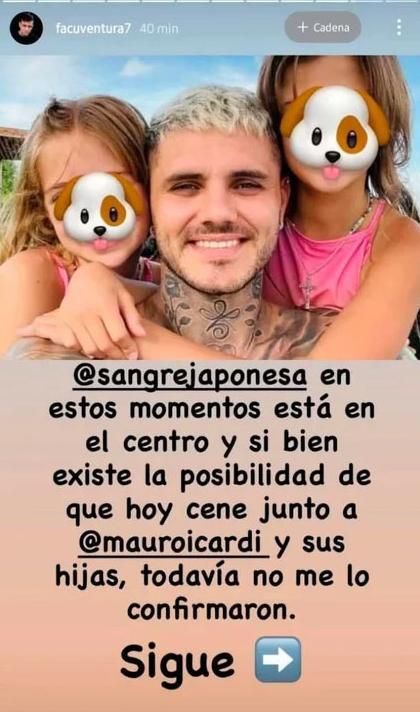 También informó que la actriz podría o no haber compartido una cena familiar junto a las hijas de Wanda: "@sangrejaponesa en estos momentos está en el centro y si bien existe la posibilidad de que hoy cene junto a @mauroicardi y sus hijas, todavía no me lo confirmaron".
