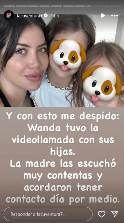 Además, reveló que las niñas pudieron tener contacto con su madre y, en vez de ser una vez al día, redujeron las llamadas: "Wanda tuvo la videollamada con sus hijas. La madre las escuchó muy contentas y acordaron tener contacto día por medio".