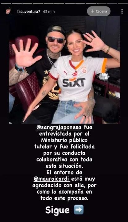 "@sangrejaponesa fue entrevistada por el Ministerio Público Tutelar y fue felicitada por su conducta colaborativa con toda esta situación. El entorno de Mauro Icardi está muy agradecido con ella, por cómo lo acompaña en todo este proceso", contó en sus historias de Instagram.
