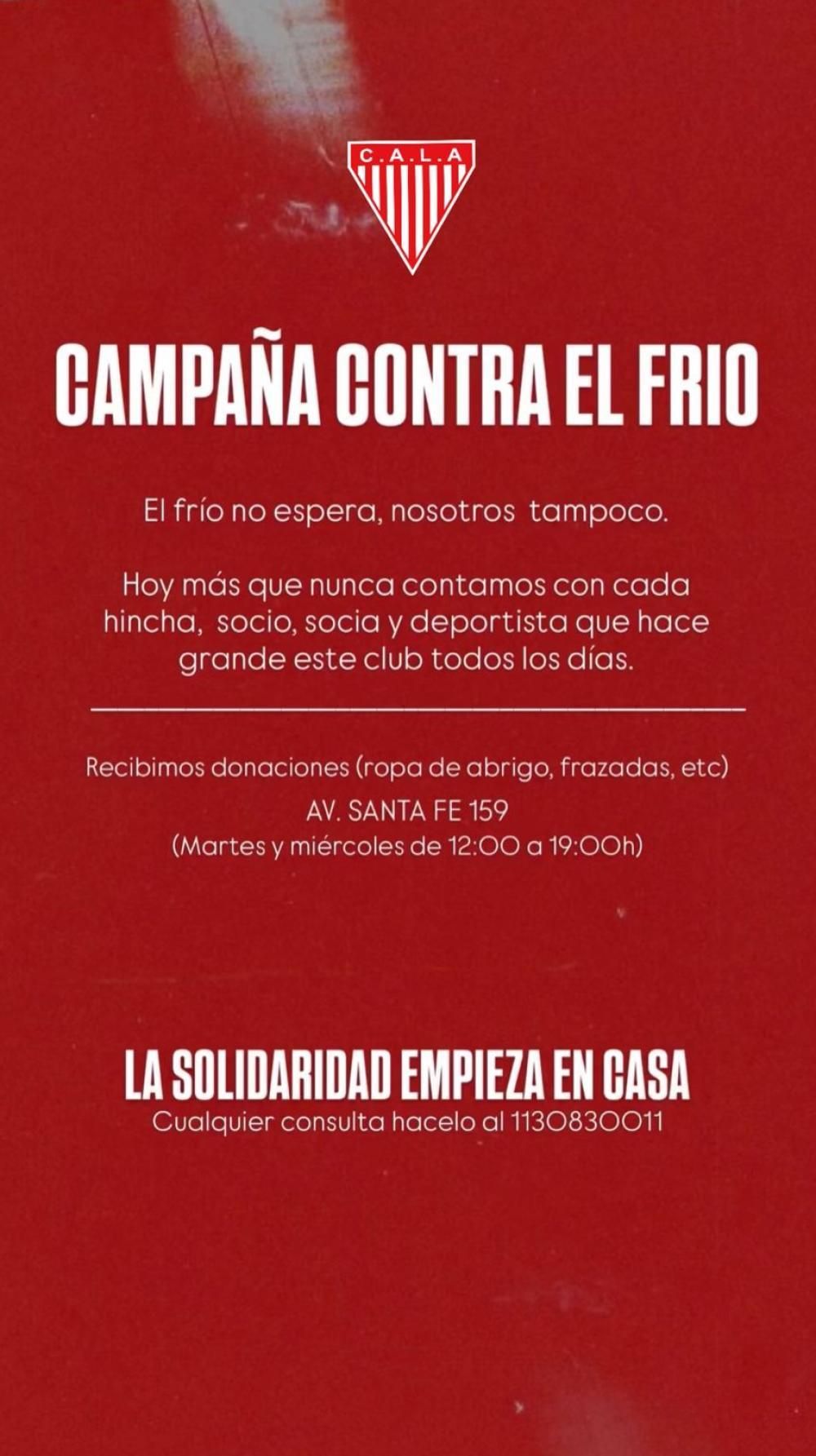 Por todo esto pidieron contar con la solidaridad de todos los hinchas, socios, socias y vecinos. "La campaña surge por la necesidad que se ve en las calles ante la ola de frío que estamos viviendo. Como en otras situaciones sociales críticas decidimos como club poner manos a la obra y ser punto de acopio y traslado de donaciones para los que más lo necesitan", recalcaron.