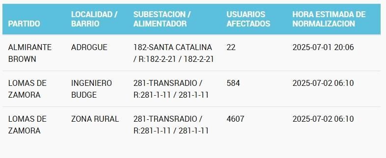 Prácticamente todas las localidades afectadas por este problema. El ENRE muestra que hay hogares sin luz en Lomas de Zamora, Banfield, Temperley, Ingeniero Budge y Villa Centenario.