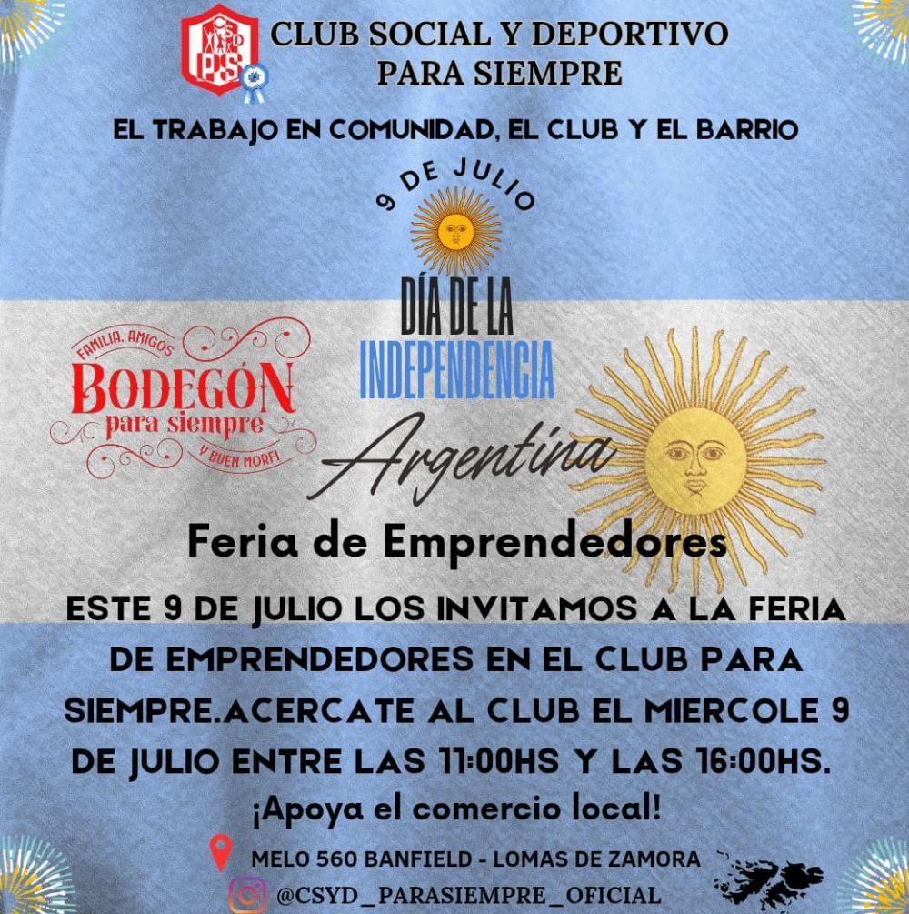 En el marco del festejo patrio del 9 de Julio, el Club Social y Deportivo Para Siempre presentará una feria de emprendedores y ofrecerá un rico locro con el objetivo de acercar a la comunidad y recaudar dinero para mejorar el espacio ubicado en Melo 560, Banfield. La cita es este miércoles, de 11 a 16.