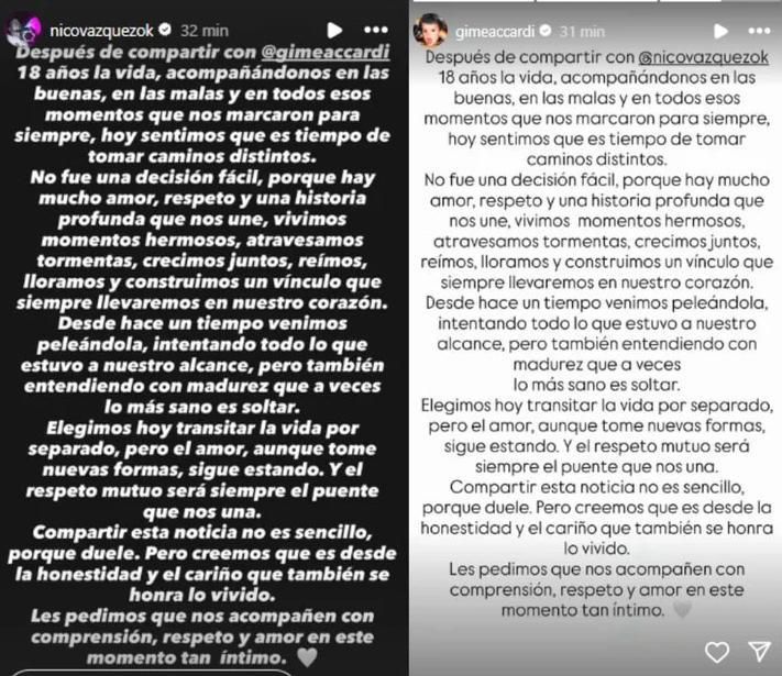 El texto que ambos postearon en sus historias de Instagram, inicia: "Después de compartir 18 años de la vida, acompañándonos en las buenas, en las malas y en todos esos momentos que nos marcaron para siempre, hoy sentimos que es tiempo de tomar caminos distintos".