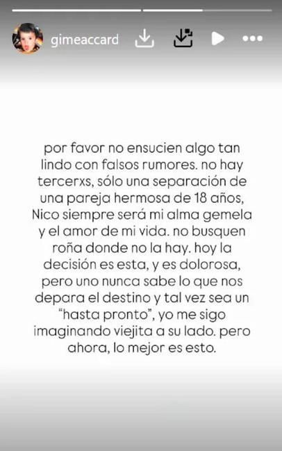 "Por favor no ensucien algo tan lindo con falsos rumores. No hay terceros, sólo una separación de una pareja hermosa de 18 años. Nico siempre será mi alma gemela y el amor de mi vida. No busquen roña donde no la hay", escribió Accardi en una historia de Instagram.